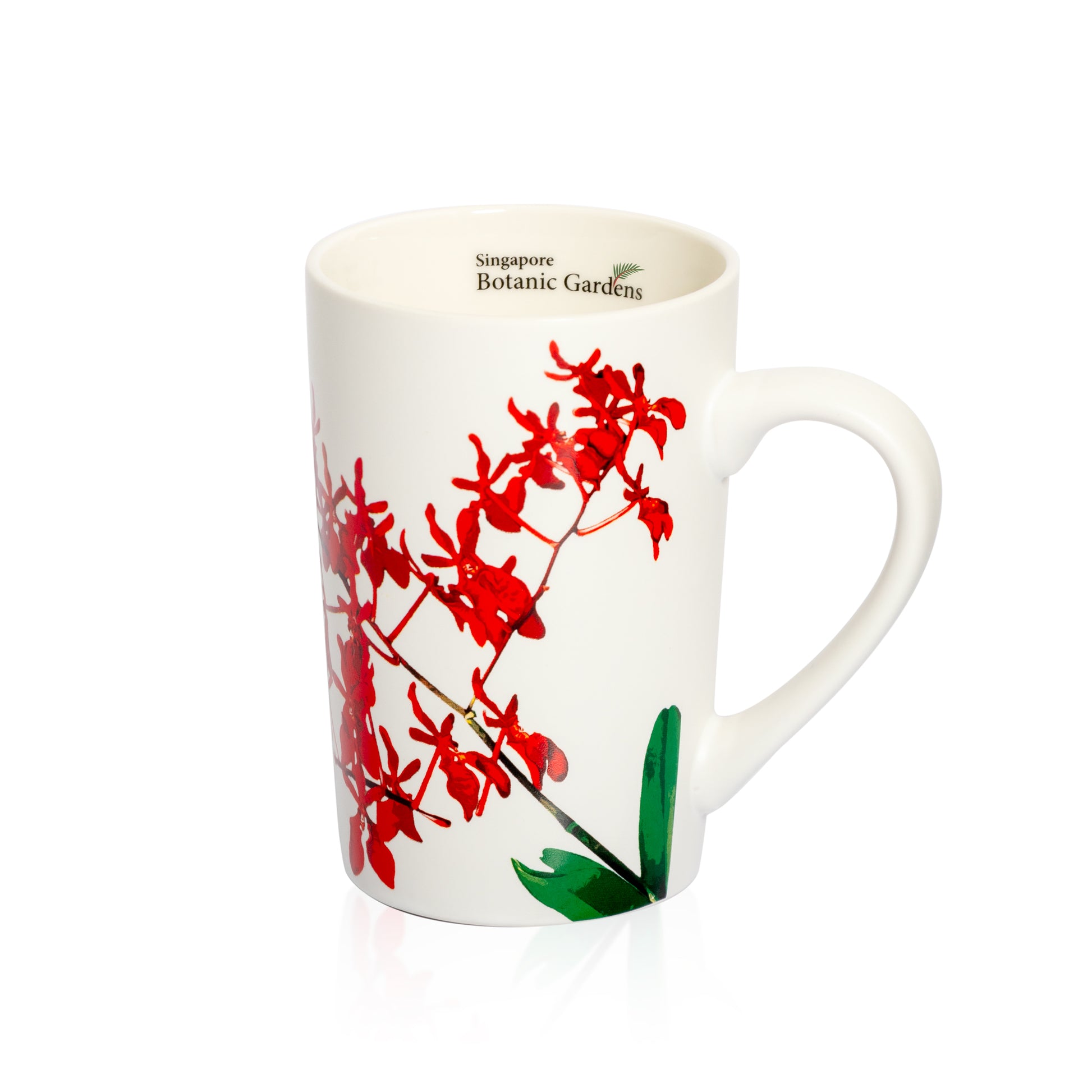 This mug features the Renanthera Singapore Botanic Gardens, an orchid hybrid that is special to the Singapore Botanic Gardens, named in 1999 to commemorate its 140th anniversary. This orchid hybrid clinched top honours at the the 17th World Orchid Conference.