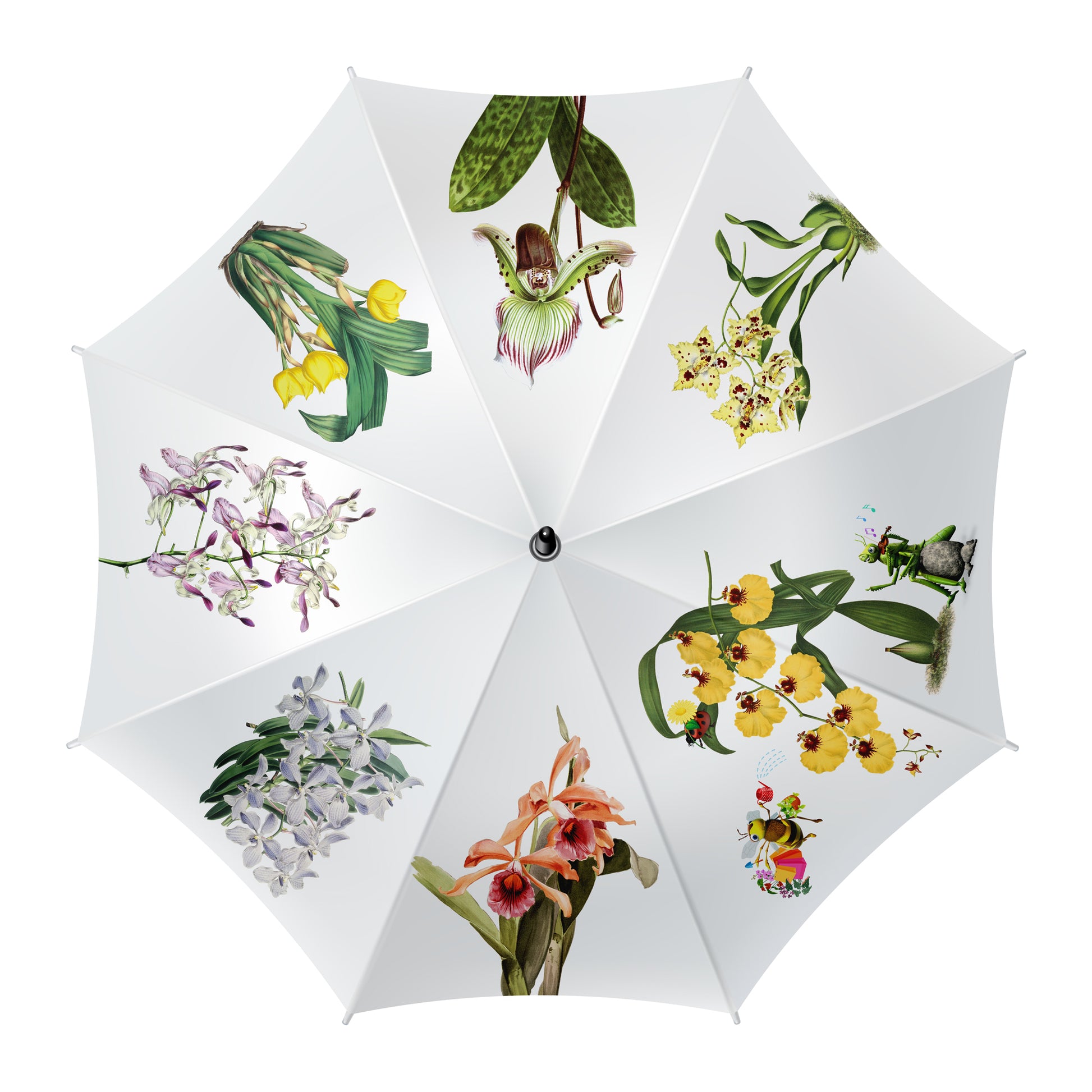 An exclusive design for the Singapore Garden Festival. The Singapore Garden Festival (SGF) unites top landscape and garden designers, florists, and horticulturists from around the world with Singapore's talented horticulturists. This umbrella features intricate Orchid motifs alongside the festival's beloved mascot.