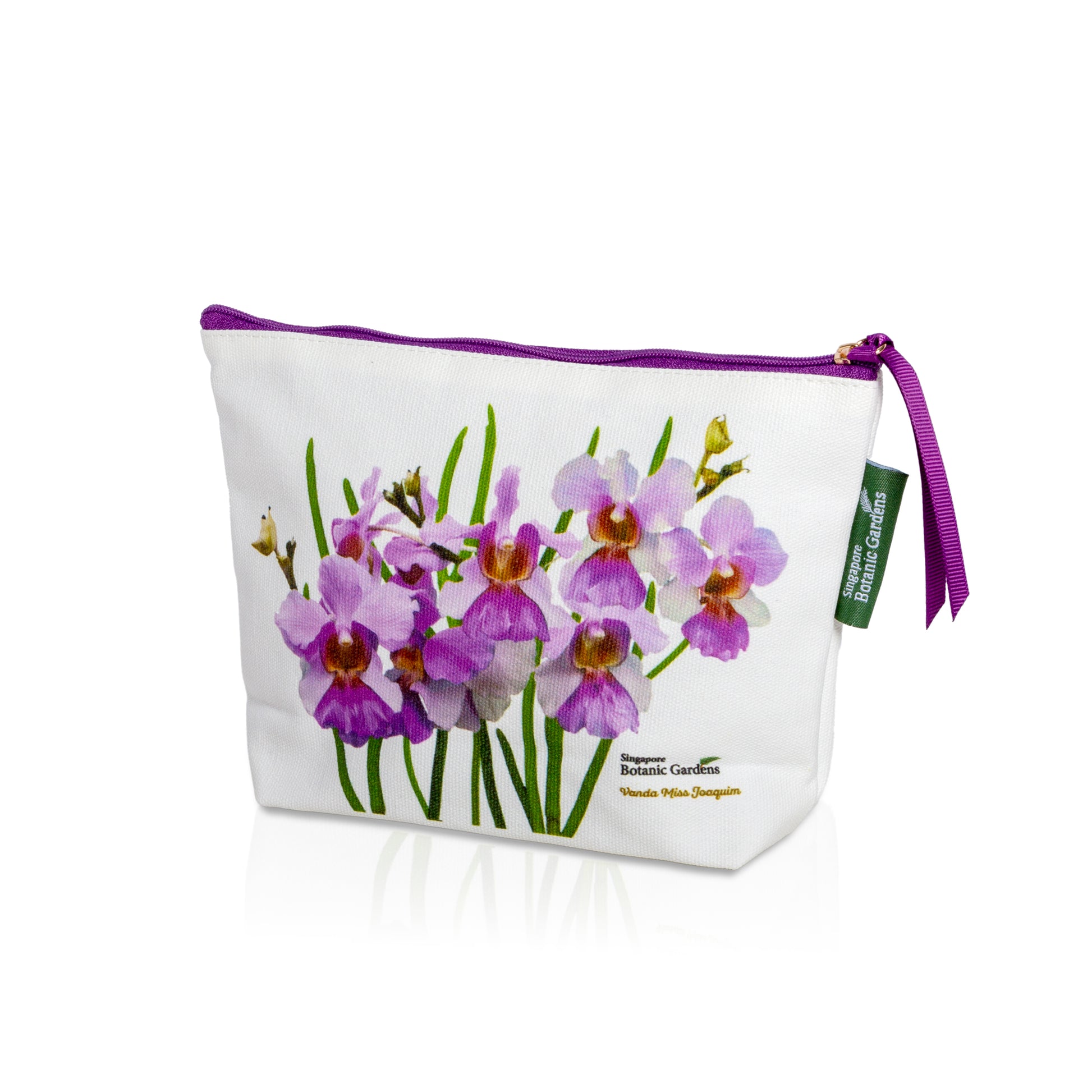 Carry your essentials in this stylish printed cosmetic pouch featuring Singapore’s national flower, Vanda Miss Joaquim.